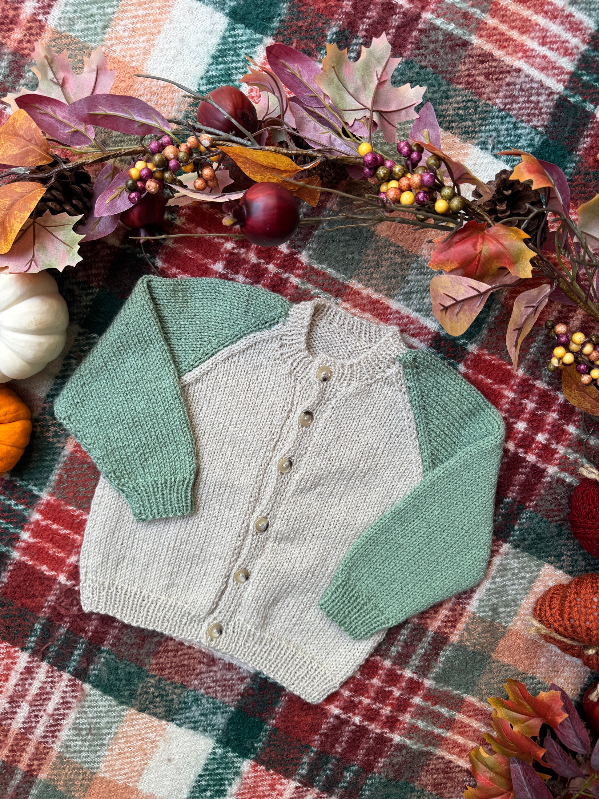 This is a beautiful hand knitted cardigan in oyster & sage 100% premium acrylic.