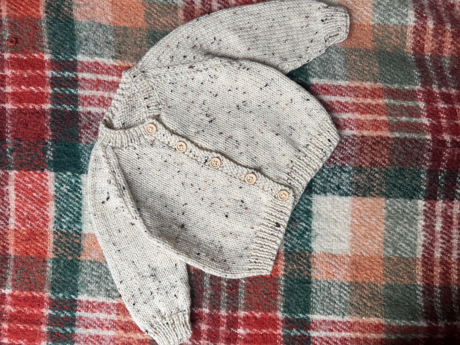 This is a beautiful hand knitted cardigan in oatmeal fleck 100% premium acrylic.